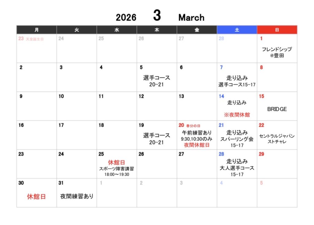 イベントや特別練習の日は、通常クラスが変更・休講となる場合がありますので、スケジュールをご確認ください。